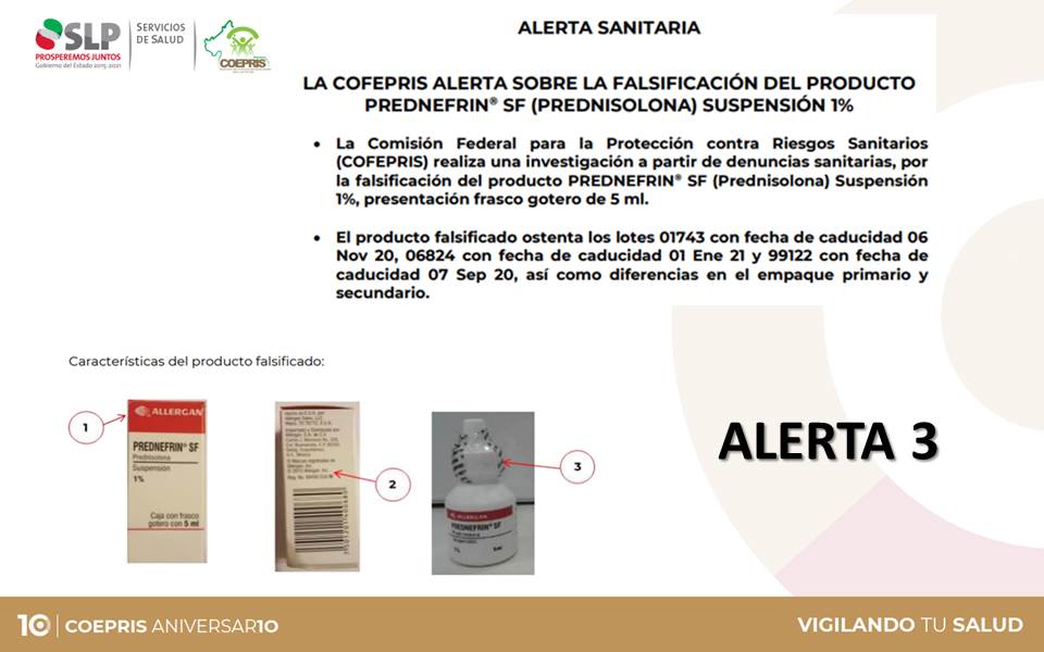 - La Comisión Federal para la Protección contra Riesgos Sanitarios (COFEPRIS) realiza una investigación a partir de denuncias sanitarias, por la falsificación del producto PREDNEFRIN® SF (Prednisolona) Suspensión 1%, presentación frasco gotero de 5 ml.