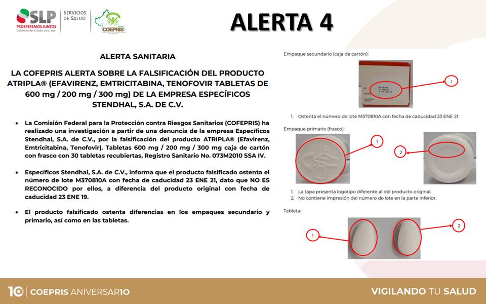 - La Comisión Federal para la Protección contra Riesgos Sanitarios (COFEPRIS) ha realizado una investigación a partir de una denuncia de la empresa Específicos Stendhal, S.A. de C.V., por la falsificación del producto ATRIPLA® (Efavirenz, Emtricitabina, Tenofovir). Tabletas 600 mg / 200 mg / 300 mg caja de cartón con frasco con 30 tabletas recubiertas, Registro Sanitario No. 073M2010 SSA IV.