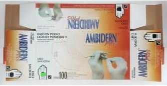Caja marrón con 100 guantes de látex: La denominación AmbidernTM Plus no existe, esta presentación imita a la legalmente registrada, presenta colores obscuros en gama de marrón a naranja y no cuenta con número de lote.